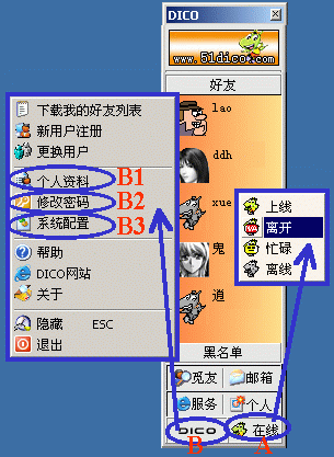 1、在線狀態(tài)設(shè)置:點(diǎn)按主窗口右下角(圖3的A處)后,可選擇"上線/離開(kāi)/忙碌/離線"四種在線狀態(tài)之一;