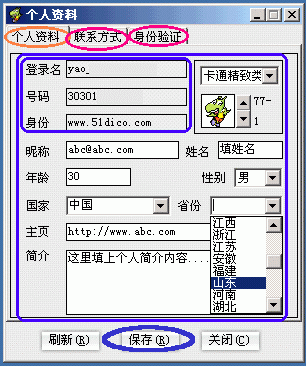 ①點(diǎn)按"個(gè)人資料"命令(圖3的B1處),彈出"個(gè)人資料"修改窗口,包括"個(gè)人資料/聯(lián)系方式/身份驗(yàn)證"這三大類選項(xiàng)卡。其中:"個(gè)人資料"選項(xiàng)卡下,除登錄名、號(hào)碼和身份這三項(xiàng)不可更改外,其余各項(xiàng)都是可填或可選項(xiàng),據(jù)你所需進(jìn)行修改就是了(下圖4)。另外,還有"聯(lián)系方式"和"身份驗(yàn)證"兩大選項(xiàng),怎么個(gè)用法自己點(diǎn)開(kāi)一看就明白了你!