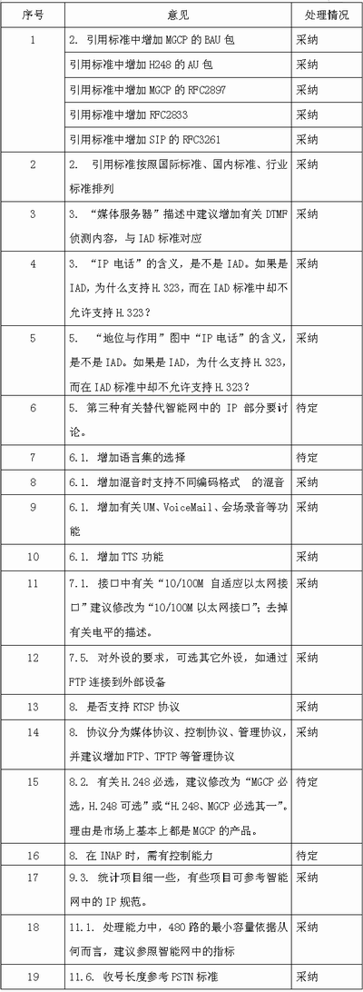 附表:8月1日~2日,網(wǎng)絡(luò)與交換標(biāo)準(zhǔn)研究組對(duì)于“基于軟交換的媒體服務(wù)器的技術(shù)要求”的征求意見(jiàn)選登。