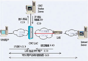 在網(wǎng)通有限公司為中建總公司建設(shè)的網(wǎng)絡(luò)中,當用戶撥上網(wǎng)絡(luò)時,網(wǎng)通有限公司的認證系統(tǒng)會根據(jù)帶域名的用戶名確定是哪個地區(qū)的VPDN用戶,并通過一系列步驟實現(xiàn)用戶與企業(yè)之間的內(nèi)部通信。