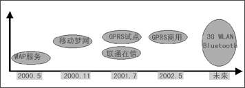2000年5月,中國移動推出了WAP服務(wù),但是由于準(zhǔn)備不足,加之中國移動沒有完全轉(zhuǎn)變經(jīng)營理念,使得WAP服務(wù)沒有達(dá)到預(yù)期的發(fā)展目標(biāo)。在吸取WAP服務(wù)的經(jīng)驗(yàn)、教訓(xùn)后,中國移動于2000年11月又推出了“移動夢網(wǎng)”計(jì)劃。在這次的業(yè)務(wù)推廣中,短消息受到了人們的寵愛,發(fā)展到現(xiàn)在,SMS已經(jīng)深入多數(shù)移動用戶的心中。2001年7月,中國聯(lián)通也推出了“聯(lián)通在信”與“移動夢網(wǎng)”進(jìn)行競爭(如圖1所示)。與此同時,中國移動又開始了GPRS的試點(diǎn)工作,經(jīng)過近一年時間,“聯(lián)通在信”并沒有取得更好的成績,而中國移動的GPRS終于開始正式商用。那么,未來的移動數(shù)據(jù)業(yè)務(wù)將依托什么來發(fā)展呢?是3G,還是WLAN、藍(lán)牙?大家只能拭目以待。