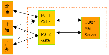 1.正常工作時北京的內(nèi)部郵件服務(wù)器通過Mail1 Gate與外部郵件服務(wù)器通訊,上海、廣州通過 Mail2 Gate與外部郵件服務(wù)器通訊;
