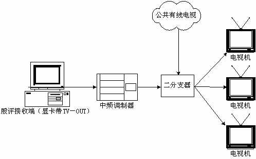 本系統(tǒng)接收端接收實時廣播時,除了用普通PC機(jī)收看,或把PC機(jī)接收到的信號輸?shù)诫娨暎ù笃粒┥鲜湛,甚至還可以接入有線電視網(wǎng)進(jìn)行播放。具體方法是通過一個接收端接收股評節(jié)目,通過帶TV-OUT的顯卡把TV信號輸出到中頻調(diào)制設(shè)備,中頻調(diào)制設(shè)備可以把基帶模擬信號轉(zhuǎn)換成一個有線電視信號,且傳輸距離遠(yuǎn),損失小,再把這個信號與有線電視信號一起接入一個二分支器(2進(jìn)1出),這就可以和公共有線電視共存,形成自己的頻道,供電視接收。
