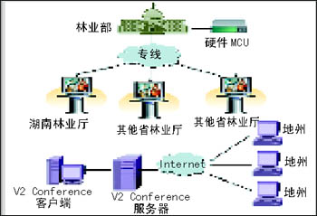 湖南省林業(yè)廳是省政府行業(yè)電子政務系統(tǒng)的示范單位,非常重視計算機網(wǎng)絡平臺上的各種軟件應用。為了減少會議支出,提高辦公效率,湖南省林業(yè)廳經(jīng)過廳務會研究決定,希望充分利用全省十四個地州市現(xiàn)有的計算機和音響設備建立全廳的網(wǎng)絡視頻會議系統(tǒng)。在經(jīng)過公開競標后,V2產(chǎn)品憑借著其優(yōu)越的性能價格比和售后服務保證,成功中標。