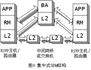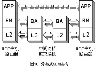 SBM有兩種形式的體系結(jié)構(gòu):集中式結(jié)構(gòu)和分布式結(jié)構(gòu),它取決于BA所處的位置,如圖9和圖10所示。不管在哪種形式的結(jié)構(gòu)中,RM都必須在需要請求資源的端系統(tǒng)中。APP表示需要使用RM的應用,它可以是用戶應用程序,也可以是高層協(xié)議(如RSVP)。