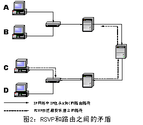 IntServ/RSVP還存在著資源預留和路由協(xié)議之間的矛盾。如圖2所示,從路由角度來看它是一條好的路徑,但從資源預留來看,由于沒有足夠的資源可以預留,不能為數(shù)據(jù)流建立起一條路徑,因此這一進程只能停留在這里,等待上層超時拆除這個應用進程,再重新建立路徑。