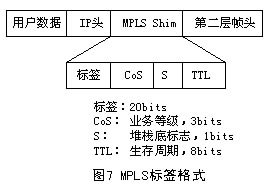 標簽的格式取決于分組封裝所在的介質(zhì)。例如,ATM封裝的分組(信元)采用VPI和/或VCI數(shù)值作為標簽,而幀中繼PDU采用DLCI作為標簽。對于那些沒有內(nèi)在標簽結(jié)構(gòu)的介質(zhì)封裝,則采用一個特殊的數(shù)值填充。圖7給出4字節(jié)填充標簽的格式,它包含一個20bits的標簽值、一個3bits的CoS值、一個1bit的堆棧標識符和一個8bits的TTL值。此外.如果填充值被插入到一個PPP或以太網(wǎng)幀中,包含在各幀頭中的一個協(xié)議ID(或以太網(wǎng)類型)表示一個幀或者一個