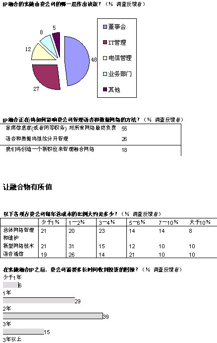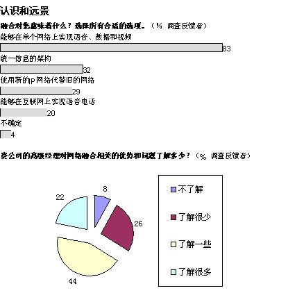 從更為廣泛的層面上看,我們的調(diào)查結(jié)果顯示:三分之一的管理人員對融合網(wǎng)絡(luò)的益處一無所知或者知之甚少。困惑的并不僅是高級經(jīng)理們:分析公司IDC近期對歐洲600余名廣域網(wǎng)管理人員進(jìn)行的調(diào)查顯示,只有五分之一的人能夠完全了解融合網(wǎng)絡(luò)所實(shí)現(xiàn)的各項(xiàng)功能。
