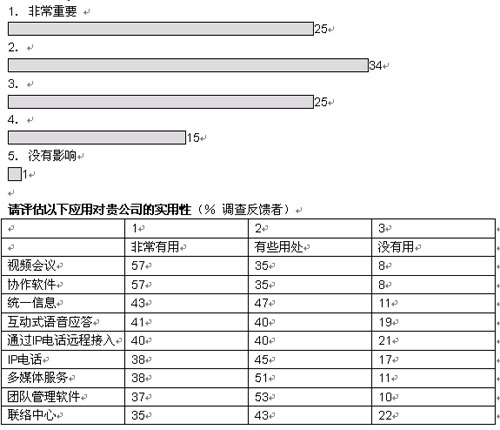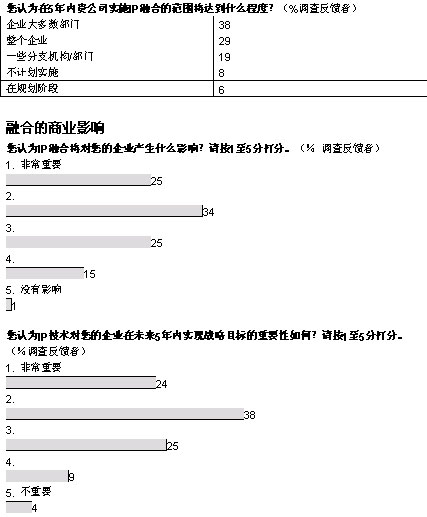 我們調(diào)查的企業(yè)中,有超過三分之二將在未來五年內(nèi)實(shí)現(xiàn)大多數(shù)或者所有部門向融合網(wǎng)絡(luò)的轉(zhuǎn)型。大部分企業(yè)采取按部就班的形式在某些特殊部門和業(yè)務(wù)開始部署。在融合應(yīng)用中,IP語音電話將在未來三年內(nèi)吸引大量投資;管理人士期望通過大幅削減公司內(nèi)部的通話費(fèi)用獲得早期的回報(bào)。在更廣泛的層面上,大多數(shù)管理者預(yù)計(jì),融合網(wǎng)絡(luò)對其企業(yè)的商業(yè)影響將會“非常重要”或者“重要”。