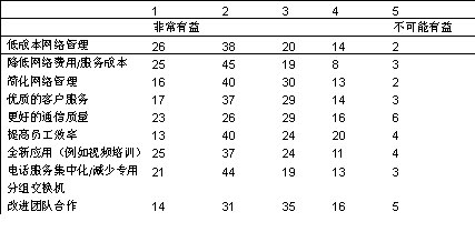 您認(rèn)為融合網(wǎng)絡(luò)將怎樣使您的企業(yè)受益(現(xiàn)在或者將來)?請為每一項(xiàng)打1至5分,1表示非常有益,5表示不可能有益。(% 調(diào)查反饋者)