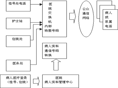 交換機識別了病人代碼后,自動轉換成病人和其家屬的通信工具號碼呼出,所用電話上顯示的是病人代碼,實現了呼叫過程與號碼隔離。