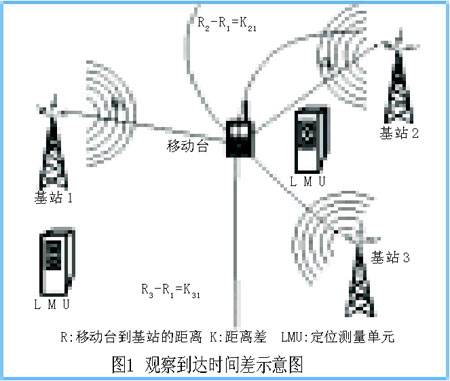 觀察到達(dá)時間差(OTDOA)是通過測量電波從發(fā)射機傳播到多個接收機的傳播時間差來確定目標(biāo)移動臺的位置。初步測量通過UE接收的下行鏈路公共導(dǎo)頻信道的到達(dá)時間差實現(xiàn)。3個基站形成的平面上,一點到兩個固定點的距離差如為定值時,該點必定在一條雙曲線上,兩條這樣的雙曲線的交點便可得到移動臺的位置,如圖1