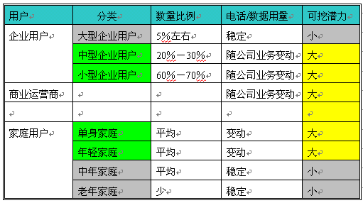 從以上表格可以清楚的顯示中小企業(yè)、商業(yè)運(yùn)營商、年青用戶對電話和數(shù)據(jù)的使用不穩(wěn)定,這就意味者可發(fā)展、擴(kuò)大使用的可能性非常大,是企業(yè)增加收入的潛在用戶,但最主要的是如何提高這些用戶的使用呢?經(jīng)濟(jì)規(guī)律告訴我們?nèi)绻闾峁┑纳唐穼τ脩粲杏,同時(shí)價(jià)廉、物美,用戶是不會拒絕的。對于電話運(yùn)營商來講就是提供給企業(yè)帶來方便、效率、節(jié)省成本、方便管理的服務(wù)的同時(shí),提高有效接通率。