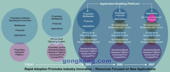 計算機和通信業(yè)已經(jīng)堅定的向開放標(biāo)準(zhǔn)演進。例如,Linux已經(jīng)被作為OS大量采用,計算模塊已經(jīng)遵循各種規(guī)范標(biāo)準(zhǔn)來設(shè)計,具有標(biāo)準(zhǔn)接口,如CPCI和ATCA。如果TEM繼續(xù)采用目前的方法集成計算機硬件和軟件模塊,全面標(biāo)準(zhǔn)化將是一個緩慢延進的過程。下一步將是基于標(biāo)準(zhǔn)的硬件平臺管理,最終可能在本年代末,遵循SAF的中間件及其上運行的應(yīng)用。