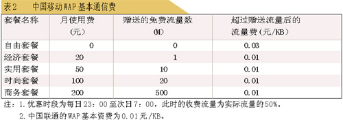 1X的優(yōu)勢(shì)是技術(shù)先進(jìn),速度快,但部分地區(qū)網(wǎng)絡(luò)覆蓋不足,開通國際漫游數(shù)據(jù)業(yè)務(wù)的國家少。此外,在收費(fèi)上雙方也有不同。表2是中國移動(dòng)與中國聯(lián)通WAP基本通信費(fèi)比較(各省之間略有不同)。