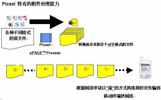 在計(jì)算機(jī)上的電子郵件的各種格式文件附件無(wú)需任何特殊處理、無(wú)需同步和轉(zhuǎn)換可以在移動(dòng)終端上閱讀。并且電子郵件的附件可以被進(jìn)一步壓縮使其通過(guò)網(wǎng)絡(luò)下載更為經(jīng)濟(jì),壓縮后服務(wù)器將文件以"流"傳送,這意味著用戶無(wú)需等待一個(gè)多頁(yè)的文件完全下載完畢后再閱讀,可以選擇任何一頁(yè)下載閱讀。