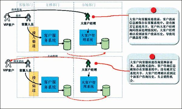投訴的后臺處理流程分布在BOSS系統(tǒng)、1860客服中心、DSMP數(shù)據(jù)業(yè)務(wù)管理平臺以及OA多個業(yè)務(wù)支撐系統(tǒng)之中,系統(tǒng)之間相對獨立,同時投訴的交互數(shù)據(jù)分散在各個系統(tǒng)內(nèi),沒有一個完整、統(tǒng)一的客戶投訴資料,從而無法在不同的服務(wù)渠道中取得完整的客戶投訴信息,影響了客戶服務(wù)的質(zhì)量。當(dāng)公司管理層需要了解某一項活動的開展情況或近期的投訴熱點、焦點問題時,操作人員只能采用傳真方式,臨時要求全省17地市、公司在一定時間內(nèi)上報,匯總后研究分析再行提交,使投訴熱點或焦點問題不能及時反饋給管理層。信息嚴(yán)重滯后,更談不上針對客戶投訴咨詢熱點問題進行數(shù)據(jù)挖掘,推出針對性的營銷策略。