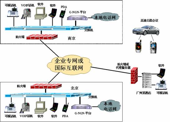 G-NGN-Softswitch產(chǎn)品可以使集團用戶通過租用網(wǎng)絡(luò)運營商的寬帶線路,或者直接借助國際互聯(lián)網(wǎng)組建成連接全市、全省乃至全國的集團內(nèi)部網(wǎng)絡(luò)電話,可以提供可視話機、非可視話機、客戶端軟件、PDA等多種便捷方式實現(xiàn)集團內(nèi)部的可視或非可視通訊。