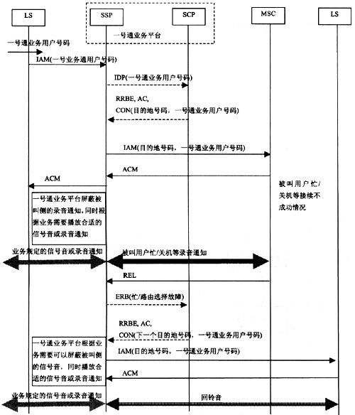 基于目前現(xiàn)網(wǎng)的信令處理方式,當(dāng)一號通業(yè)務(wù)用戶所設(shè)定的目的地號碼為移動用戶時(shí),如果出現(xiàn)被叫用戶忙、關(guān)機(jī)等接續(xù)不成功情況,現(xiàn)有的移動交換機(jī)會給主叫用戶播放錄音通知,通知用戶,如果主叫用戶不掛機(jī),則在通知播放完畢后向前端交換機(jī)后向返回REL消息,釋放呼叫。一號通業(yè)務(wù)平臺收到釋放消息后根據(jù)業(yè)務(wù)需要,進(jìn)行下次接續(xù)。如果按照原有的信令流程,主叫用戶會先聽到被叫用戶忙或關(guān)機(jī)的錄音通知,然后又聽到下一個呼叫的回鈴音。為了避免出現(xiàn)這種現(xiàn)象,一號通業(yè)務(wù)平臺要能夠屏蔽被叫側(cè)播放的錄音通知和信號音,并根據(jù)業(yè)務(wù)需要向主叫用戶播放合適的信號音或錄音通知,具體的屏蔽方式由一號通平臺自行確定。以智能網(wǎng)實(shí)現(xiàn)、ISUP消息為例,具體的消息流程如圖3所示。