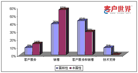 從業(yè)務(wù)功能看來,國際性呼叫中心和本國性呼叫中心承擔(dān)著不同的角色。9%的國際性呼叫中心和14%的本國性呼叫中心提供僅限于客戶服務(wù),例如賬號(hào)查詢和催費(fèi)收款。39%的國際性呼叫中心和59%的本國性呼叫中心專門展開網(wǎng)上營銷和銷售(外撥為主)。43%的國際性呼叫中心和29%的本國性呼叫中心同時(shí)承擔(dān)客戶服務(wù)和銷售功能。最后,我們調(diào)查到9%的國際性呼叫中心專門從事技術(shù)支持,而且這些中心專門為國際市場設(shè)立。服務(wù)功能上的差異會(huì)對商業(yè)定位和人力資源管理提出不同的要求。