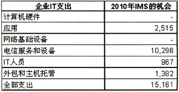 在企業(yè)市場(chǎng),運(yùn)營(yíng)商將獲得重要的收入機(jī)會(huì)。IMS是運(yùn)營(yíng)商從網(wǎng)絡(luò)級(jí)IT應(yīng)用、主機(jī)數(shù)據(jù)中心服務(wù)和專業(yè)服務(wù)上獲得收入的希望。到2010年IMS有機(jī)會(huì)為美國(guó)運(yùn)營(yíng)商產(chǎn)生超過(guò)150億美元的年收入。雖然不能完全保證這個(gè)規(guī)模的收入貢獻(xiàn),但是任何運(yùn)營(yíng)商都不會(huì)輕易錯(cuò)過(guò)這個(gè)巨大的潛在市場(chǎng)機(jī)會(huì)。