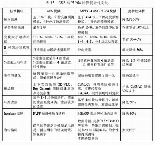 表13對AVS與H.264的計算實現(xiàn)復(fù)雜性進行扼要對比,大致估算,AVS解碼復(fù)雜度相當于H.264的30%,AVS編碼復(fù)雜度相當于H.264的70%。