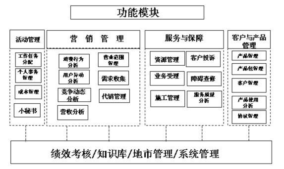 本系統(tǒng)主要有客戶與產(chǎn)品管理、營銷管理、服務(wù)與保障、活動管理、績效考核五大主要功能,如下圖所示。