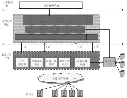 IPTV業(yè)務(wù)對系統(tǒng)運(yùn)行、管理、網(wǎng)絡(luò)的要求都非常高,因而必須采用分布式結(jié)構(gòu)來進(jìn)行部署。從部署層次來分,可分為內(nèi)容管理中心、內(nèi)容集成運(yùn)營平臺、業(yè)務(wù)支撐平臺。