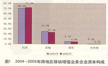 電信增值市場(chǎng)的開放和政策環(huán)境的優(yōu)化,也吸引了眾多的外資企業(yè)。電信增值服務(wù)的投資來源、經(jīng)營(yíng)主體、服務(wù)目標(biāo)、經(jīng)濟(jì)功能與基礎(chǔ)電信業(yè)務(wù)存在明顯差異,彼此間有競(jìng)爭(zhēng)關(guān)系,但更多的是補(bǔ)充、豐富的關(guān)系。目前,我國(guó)已放開電信增值市場(chǎng)準(zhǔn)入,從2005年起,整個(gè)電信增值業(yè)務(wù)市場(chǎng)就呈現(xiàn)出持續(xù)快速發(fā)展的勢(shì)頭,民營(yíng)資本已經(jīng)發(fā)展成為電信增值業(yè)務(wù)領(lǐng)域的主力軍,其所占企業(yè)數(shù)量比例已超過70%(見圖1)。