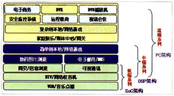 當(dāng)前國內(nèi)IPTV業(yè)務(wù)試點中采用的機(jī)頂盒,包括華為、中興、UT等主流廠商都主要采用了基于DSP架構(gòu)的技術(shù)解決方案,除能滿足點播、直播等標(biāo)清業(yè)務(wù)需求外,還可通過軟件升級,以支持信息瀏覽、簡單的本地/網(wǎng)絡(luò)游戲等增值業(yè)務(wù),基本上可滿足上述業(yè)務(wù)一定規(guī)模用戶商用要求。