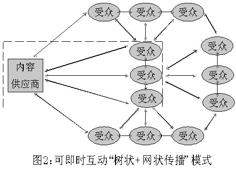 我們認(rèn)為,手機(jī)短信新聞的傳播方式,是“樹(shù)狀+網(wǎng)狀傳播”,即由新聞內(nèi)容提供方完成點(diǎn)到面的“樹(shù)狀傳播”后,信息接受終端又可以完成一個(gè)“網(wǎng)狀傳播”。因此,手機(jī)短信新聞,不僅傳播鏈較長(zhǎng),而且可以相互交錯(cuò)形成網(wǎng)狀互動(dòng),“傳者”和“受者”可以隨時(shí)出現(xiàn)“角色互換”。(見(jiàn)圖2)