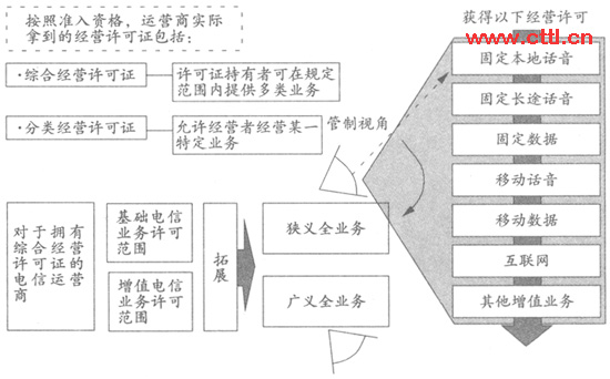 全業(yè)務(wù)可從電信管制、業(yè)務(wù)屬性及市場三個角度進(jìn)行定義。全業(yè)務(wù)運營則可以從兩個角度來看待,一是從管制視角帶來的狹義全業(yè)務(wù);一是從多業(yè)務(wù)領(lǐng)域與電信結(jié)合的廣義全業(yè)務(wù)。具體表述可參照圖1。