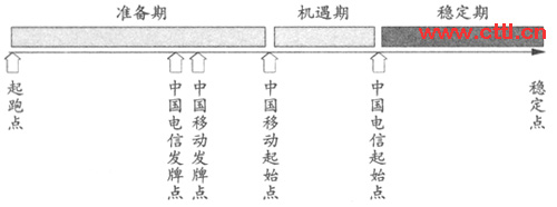 此版本是表示中國移動進(jìn)入3G業(yè)務(wù)運營早于競爭對手。圖4根據(jù)中國移動和中國電信發(fā)放牌照的不同時期而將全業(yè)務(wù)運營市場策略劃分成準(zhǔn)備期、機(jī)遇期和穩(wěn)定期。