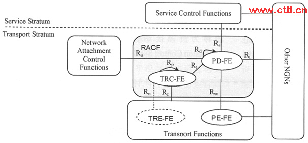 RACF由策略決策功能實(shí)體PD-FE和傳送資源控制功能TRC-FE兩個(gè)功能實(shí)體組成。PD-FE基于網(wǎng)絡(luò)策略規(guī)則、業(yè)務(wù)控制功能SCF提供的業(yè)務(wù)信息、網(wǎng)絡(luò)附著控制功能NACF提供的傳送層簽約信息,以及TRC-FE提供的資源接納決策結(jié)果,做出網(wǎng)絡(luò)資源接納控制的最后決策。可以基于每個(gè)流對(duì)傳送層的策略執(zhí)行功能實(shí)體。PE-FE下發(fā)資源接納控制策略。TRC-FE負(fù)責(zé)收集和維護(hù)傳送網(wǎng)的拓?fù)浜唾Y源狀態(tài)信息,基于拓?fù)、連接性、網(wǎng)絡(luò)、節(jié)點(diǎn)資源的可用性以及接入網(wǎng)中的傳送層簽約信息等網(wǎng)絡(luò)信息控制資源的使用,提供傳送網(wǎng)絡(luò)接納控制的決策。PD-FE通過Rt參考點(diǎn)請(qǐng)求TRC-FE檢測(cè)或者決定所請(qǐng)求的媒體流路徑上的QoS資源。