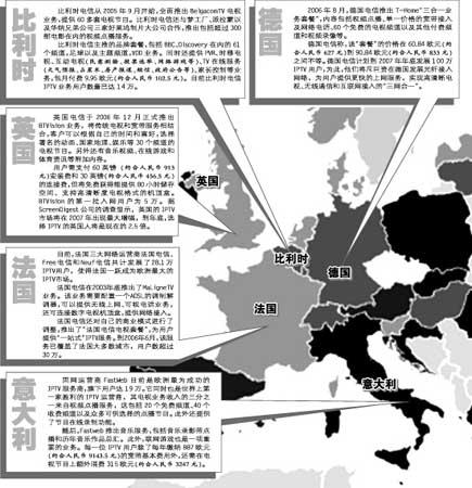對于歐洲觀眾來說,IPTV(網絡付費電視)就是他們未來的生活主畫面之一。他們只需每月交付30歐元(約合人民幣309元)到60歐元(約合人民幣618元)的費用,便可在電視或電腦上選擇收看上百個頻道的電視節(jié)目。歐洲雖然缺乏強大的衛(wèi)星網絡作為技術支持,不過卻擁有多家實力雄厚的電信營運商,這些巨頭們擁有相同的興趣和市場,正考慮是否聯(lián)合經營,共同分食歐洲網絡電話電視市場這塊“大蛋糕”。