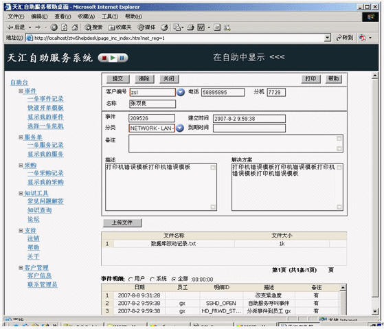 事件記錄應該在某個服務臺工具中記錄和跟蹤,該工具最好是作為集成的服務管理工具集的構成部分。該工具應該在引發(fā)新的事件時提供最基本的事件記錄。比如為了幫助提高效率,當你在天匯幫助臺的用于記錄事件的事件窗口中輸入請求發(fā)起者的姓名時,利用客戶數(shù)據(jù)庫可以自動填充諸如位置、部門和聯(lián)系詳細信息等字段。天匯幫助臺還支持使用計算機電話集成