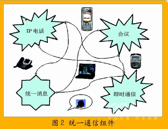 通信的終端可能是桌面電話、計(jì)算機(jī)、手機(jī)或者PDA。這4個(gè)部分之間存在緊密的聯(lián)系,比如說電話語音可以轉(zhuǎn)換為統(tǒng)一消息;電話不可達(dá)時(shí),可以采用即時(shí)消息溝通或者小組成員可以使用多種方式參與到同一個(gè)會(huì)議中來等等。而所有這些聯(lián)系可能建立在統(tǒng)一的平臺(tái)之上: