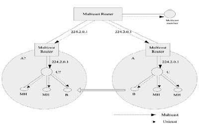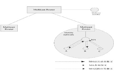 host,簡稱MH)在一個(gè)子網(wǎng)中,如果要加入某個(gè)組播組,就向當(dāng)?shù)刈泳W(wǎng)的MA發(fā)送一個(gè)加入請(qǐng)求,在MA向組播路由器發(fā)送加入組播組的請(qǐng)求后,通過組播路由協(xié)議建立到該MA的組播樹。
