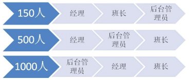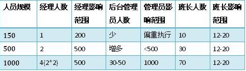 當(dāng)員工人數(shù)在150人的時候,班長往往有10位左右。經(jīng)理能有足夠的精力來兼顧全局,甚至和大部分員工認識,親自制定關(guān)鍵流程和制度,參與每次的重要信息傳達。那么這個時候,經(jīng)理無疑是最為重要的管理者。班長是第二重要的,后臺管理員(質(zhì)檢、維護、投訴處理、綜合行政等)就更多是個執(zhí)行角色。