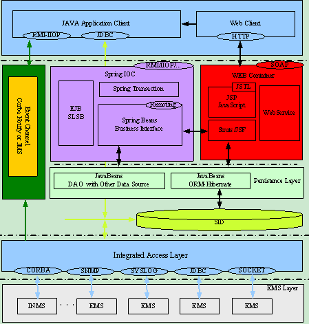 展現(xiàn)層分為兩類用戶界面,一種是Java Application類胖用戶界面;另外一種是純HTTP Web瘦客戶界面。Java Application頁面用于實現(xiàn)拓撲管理等現(xiàn)階段不易于采用Web技術實現(xiàn)的交互頁面,與其他各層的交互協(xié)議主要采用RMI-IIOP或JDBC。