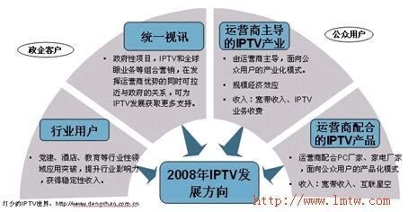 2008年,IPTV市場,因?yàn)榘l(fā)展速度明顯慢于了市場進(jìn)度和技術(shù)演進(jìn)。因此在原有的運(yùn)營商產(chǎn)業(yè)化推動形勢下,終端廠家推動下的產(chǎn)品化發(fā)展模式也會得到更大的發(fā)展空間,而這在一定程度上雖會推動用戶對IPTV的認(rèn)知度,同時也會分化一部分IPTV產(chǎn)業(yè)化的動力。