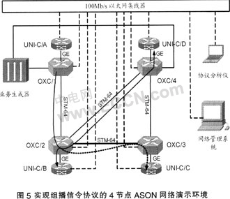 ....圖5顯示了一個(gè)用來(lái)實(shí)現(xiàn)組播信令協(xié)議的4節(jié)點(diǎn)ASON網(wǎng)絡(luò)演示環(huán)境。圖中OXC的核心交換矩陣是基于時(shí)分交換,交換粒度為一個(gè)SDH