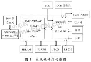 系統(tǒng)硬件主要由TI公司的TMS320DM643和三星公司的S3C2410組成。其中TMS320DM643完成音頻壓縮編解碼G.711/G.729/G.723.1和視頻壓縮編解碼H.264;S3C2410完成SIP協(xié)議和嵌入式OS及各種接口如RS232、復(fù)合視頻輸入/輸出、數(shù)字CCD攝像頭、LCD、RJ45、以太網(wǎng)、鍵盤等。音頻信號的輸入/輸出通過TI公司的TLV320AIC23送入TMS320DM643進(jìn)行壓縮編碼。