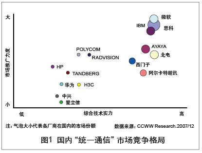 “統(tǒng)一通信”與傳統(tǒng)通信的根本區(qū)別在于不僅僅是網(wǎng)絡(luò)的融合,也是應(yīng)用的融合。從這個(gè)層面來(lái)看,“統(tǒng)一通信”真正帶給用戶的是成本的降低、工作效率的提升以及整個(gè)運(yùn)行機(jī)制的改變。“統(tǒng)一通信”是以人性化為特征應(yīng)用層面的融合,這種融合囊括了更多的內(nèi)容、覆蓋更廣闊的領(lǐng)域、具有更大的力量,它使得通信產(chǎn)業(yè)與IT產(chǎn)業(yè),通信設(shè)備商、軟件廠商與電信運(yùn)營(yíng)商之間的邊界越來(lái)越模糊,跨行業(yè)、跨領(lǐng)域的聯(lián)盟與合作成為開拓市場(chǎng)的必需。但隨著眾廠商的紛紛加入,多款“統(tǒng)一通信”產(chǎn)品及解決方案的推出,“統(tǒng)一通信”市場(chǎng)展現(xiàn)出了勃勃生機(jī)和巨大的成長(zhǎng)潛力。在這些廠商中,有市場(chǎng)調(diào)研數(shù)據(jù)顯示思科市場(chǎng)份額領(lǐng)先,市場(chǎng)占有率高達(dá)35%。各類廠商之間既有競(jìng)爭(zhēng)又有合作,但還沒有一個(gè)廠商占絕對(duì)優(yōu)勢(shì)。實(shí)際上,“統(tǒng)一通信”市場(chǎng)上的競(jìng)爭(zhēng)者并不僅僅是這幾家巨頭,眾多網(wǎng)絡(luò)工具廠商、商用電話廠商也參與了這一競(jìng)爭(zhēng)平臺(tái)。幾乎所有和ICT有關(guān)的巨頭廠商都集中在了這個(gè)領(lǐng)域,“統(tǒng)一通信”正進(jìn)入群雄爭(zhēng)霸的時(shí)代。國(guó)內(nèi)“統(tǒng)一通信”市場(chǎng)競(jìng)爭(zhēng)格局如圖1所示。