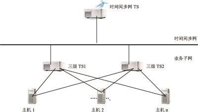 四川電信時(shí)間同步網(wǎng)對(duì)數(shù)據(jù)網(wǎng)元的授時(shí),統(tǒng)一采用設(shè)置三級(jí)時(shí)間服務(wù)器方式。該方式須在數(shù)據(jù)網(wǎng)元內(nèi)部選定一臺(tái)或兩臺(tái)機(jī)器作為三級(jí)TS,三級(jí)TS同步到時(shí)間同步網(wǎng)的時(shí)間服務(wù)器,系統(tǒng)內(nèi)的其他主機(jī)與三級(jí)TS保持同步,如圖2所示。