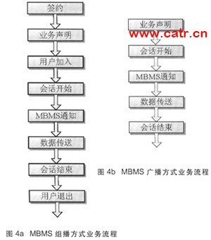 MBMS可應(yīng)用組播模式和廣播模式兩種業(yè)務(wù)模式。廣播模式接近于數(shù)字電視業(yè)務(wù),而組播模式專注和定位于群業(yè)務(wù)。組播模式提供了更好的計費(fèi)特性,包括服務(wù)訂閱、接入和推出功能,需要用戶簽約相應(yīng)組播組,進(jìn)行業(yè)務(wù)激活,并產(chǎn)生相應(yīng)的計費(fèi)信息,而廣播業(yè)務(wù)不需要小區(qū)中所有用戶都制定該業(yè)務(wù)便可以獲得。由于組播和廣播模式在業(yè)務(wù)需求上存在不同,導(dǎo)致其業(yè)務(wù)流程也不同(見圖4a、圖4b)。