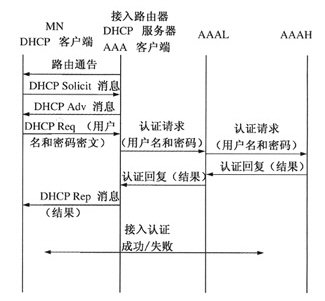 當DHCPv6服務器調用子進程執(zhí)行AAA客戶端程序后,AAA客戶端將把從MN傳過來的密碼和用戶名添加到認證請求選項中,向AAAL進行認證。AAAL將收到的消息轉發(fā)給AAAH服務器,AAAH收到認證請求后進行認證。如用戶名和密碼正確,則返回Accecpt響應消息,標志認證成功;如用戶名或者密碼錯誤,則返回Reject響應消息,標志認證失敗。AAAL收到認證回復消息后記錄認證信息,下次認證時只需詢問AAAL,減少認證步驟。
