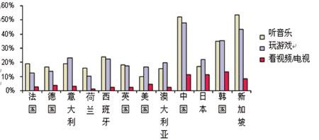 除打電話、發(fā)短信、拍照、手機郵箱以外,音樂、游戲也是用戶每周使用較多的業(yè)務(wù)。當被問及其它應(yīng)用時,來自中國、新加坡還有韓國的部分被調(diào)查者表示,他們會經(jīng)常用手機來聽音樂和玩游戲。其中,中國是惟一一個選擇用手機聽音樂的用戶數(shù)與選擇用手機拍照的用戶數(shù)旗鼓相當?shù)膰。但有趣的是,手機在中國不太可能成為MP3的替代品,仍然只是一個便攜播放器。在新加坡,手機替代MP3的可能性就大多了。Ovum認為,這是由于高端手機在新加坡市場占有很高的比例。在歐洲和美國,使用手機來聽音樂和玩游戲的比例則比亞洲少了很多,但值得鼓勵的是仍有超過10%的被調(diào)查者選擇了該答案。(見圖2)