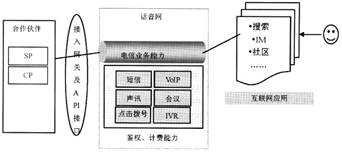 互聯(lián)網(wǎng)應(yīng)用與電信網(wǎng)絡(luò)資源能力結(jié)合提供的新型話音業(yè)務(wù)包括多種類型:與VoIP、點(diǎn)擊撥號(hào)等呼叫類功能結(jié)合的應(yīng)用;與聲訊、IVR等語音交互性功能結(jié)合的應(yīng)用;短信等信息功能結(jié)合的應(yīng)用。