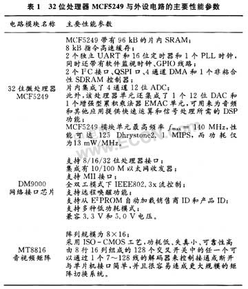 MCF5249模塊單元主要由32位處理器MCF5249和若于外圍器件AM29LV160DB90快閃存儲器、K4S281632SDRAM、SP3223串行通訊電路、DM9000網(wǎng)絡接口芯片、MT8816音視頻矩陣電路等硬件構成。其主要性能如下表1所示。